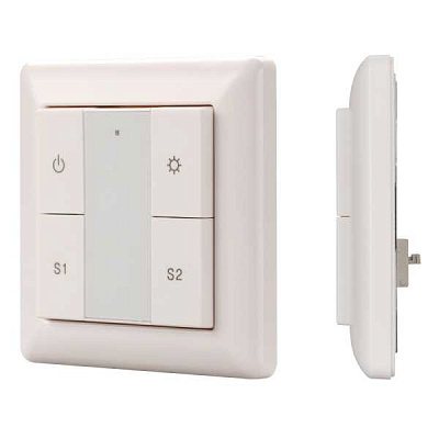 INTELLIGENT ARLIGHT Панель DALI-223-1G-2S-IN (BUS) 025500 Встраиваемая кнопочная белая пластиковая панель для работы по протоколу DALI. Включение/выключение, диммирование, вызов и сохранение 2-х сцен в 1 группе. Установка номера группы и номера первой сцены выполняется переключателями на корпусе.