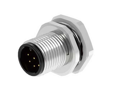 Вилочный разъем в панель M12A03C-MPBFHUR Вилочный разъем в панель, 3 полюса, M12, монтаж с передней стороны панели, гайка сзади, PCB (180 град.), A-Code, 4А, 250V, резьба на гайке M16*1.5, резьбовое соединение: латунь, неэкранированный