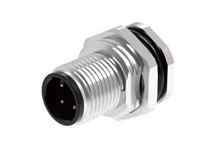 Вилочный разъем в панель M12A03C-MPBRHUR Вилочный разъем в панель, 3 полюса, M12, монтаж с задней стороны панели, гайка спереди, PCB (180 град.), A-Code, 4А, 250V, резьба на гайке M16*1.5, резьбовое соединение: латунь, неэкранированный