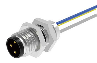 Вилочный разъем в панель M8A04C-MFHA-UC0.5 Вилочный разъем в панель, 4 полюса, M8, монтаж с передней стороны панели, гайка сзади, с проводом 0,5 метра, A-Code, 3А, 60V, резьба на гайке M8*0.5, резьбовое соединение: латунь