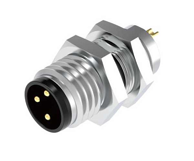 Вилочный разъем в панель M8A06C-MPSFHUA Вилочный разъем в панель, 6 полюсов, M8, монтаж с передней стороны панели, гайка сзади, фиксация провода пайкой, A-Code, 1,5А, 30V, резьба на гайке M8*0.5, резьбовое соединение: латунь
