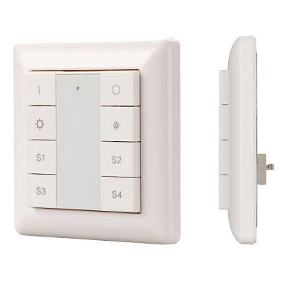 INTELLIGENT ARLIGHT Панель DALI-223-1G-4S-IN (BUS) 025505 Встраиваемая кнопочная белая пластиковая панель для работы по протоколу DALI. Включение/выключение, диммирование, вызов и сохранение 4-х сцен в 1 группе. Установка номера группы и номера первой сцены выполняется переключателями на корпусе.