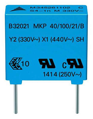 B32021A3222M189 Конденсатор пленочный помехоподавляющий Y2 2200пФ 300В переменного тока ±20% (13 X 4 X 9мм) радиальные выводы пластиковый прямоугольный корпус 10мм