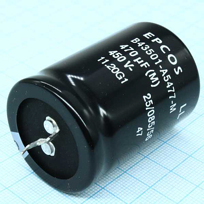 B43501A5477M Конденсатор алюминиевый электролитический 470мкФ 450В ±20% (35 X 50мм) защелкиваемые выводы 10мм 0.28Ом 2700мА 10000час 85°С россыпь