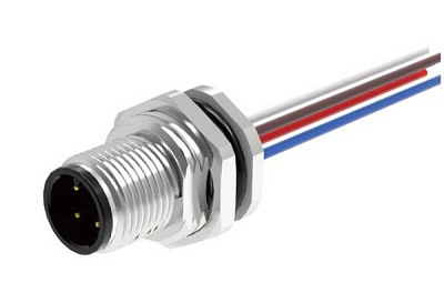 Вилочный разъем в панель M12A03C-MRHR-UC0.5 Вилочный разъем в панель, 3 полюса, M12, монтаж с задней стороны панели, гайка спереди, с проводом 0,5 метра, A-Code, 4А, 250V, резьба на гайке M16*1.5, резьбовое соединение: латунь, не экранированный